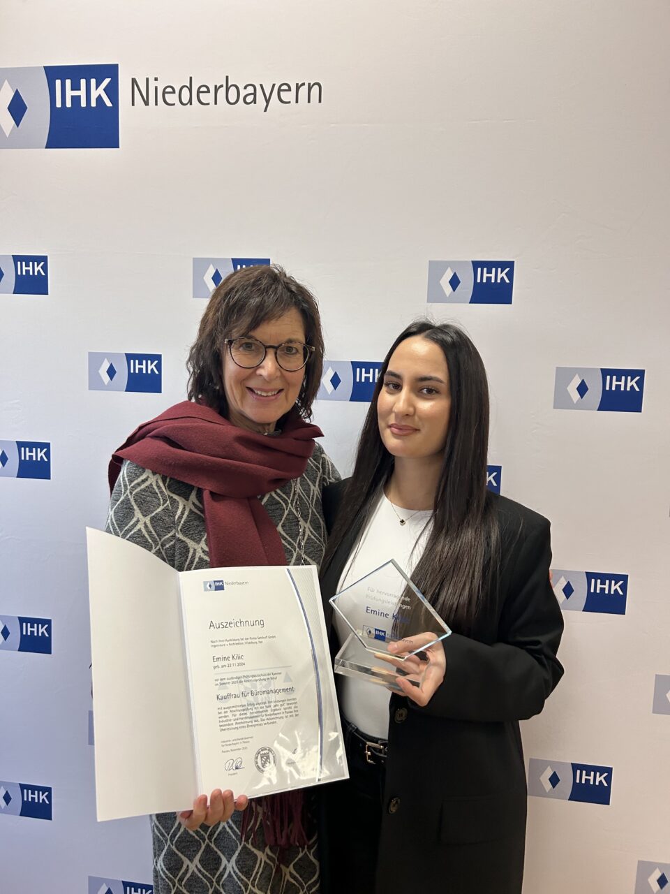 Die Industrie- und Handelskammer Niederbayern hat unsere Mitarbeiterin Emine Kilic, die ihre Ausbildung zur Kauffrau für Büromanagement bei der SEHLHOFF GMBH erfolgreich abgeschlossen hat, als eine der Prüfungsbesten der Abschlussprüfung Sommer 2025 ausgezeichnet. Die Ehrung fand am 20. November 2025 am neuen IHK-Standort in Landshut statt.